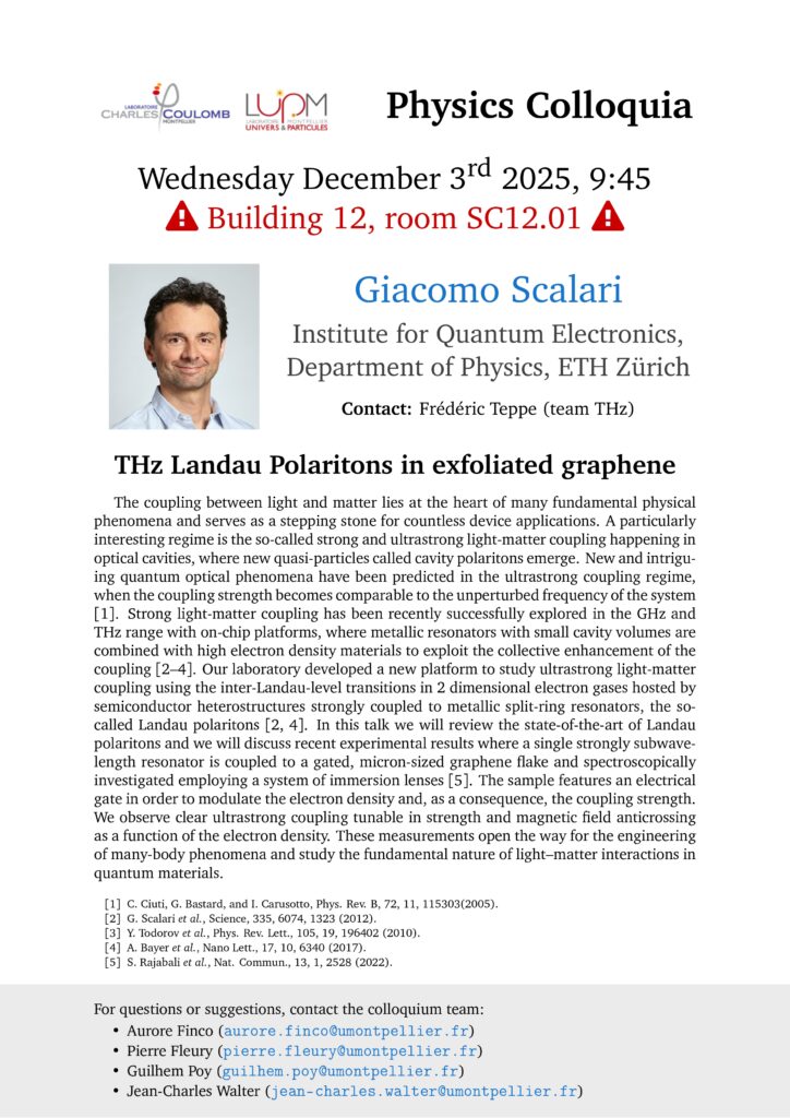 Colloquium de Physique Cet évènement est passé ! Type d'évènement : Colloquium Dates : 3 décembre 2025 Horaires : 09h45 Lieu : Université de Montpellier - Campus Triolet - SC12.01 Le prochain colloquium aura lieu mercredi 3 décembre, à 9h45 en salle SC12.01. Il sera intitulé « THz Landau Polaritons in exfoliated graphene« , et donné par Giacomo SCALARI, ETH-Zurich.