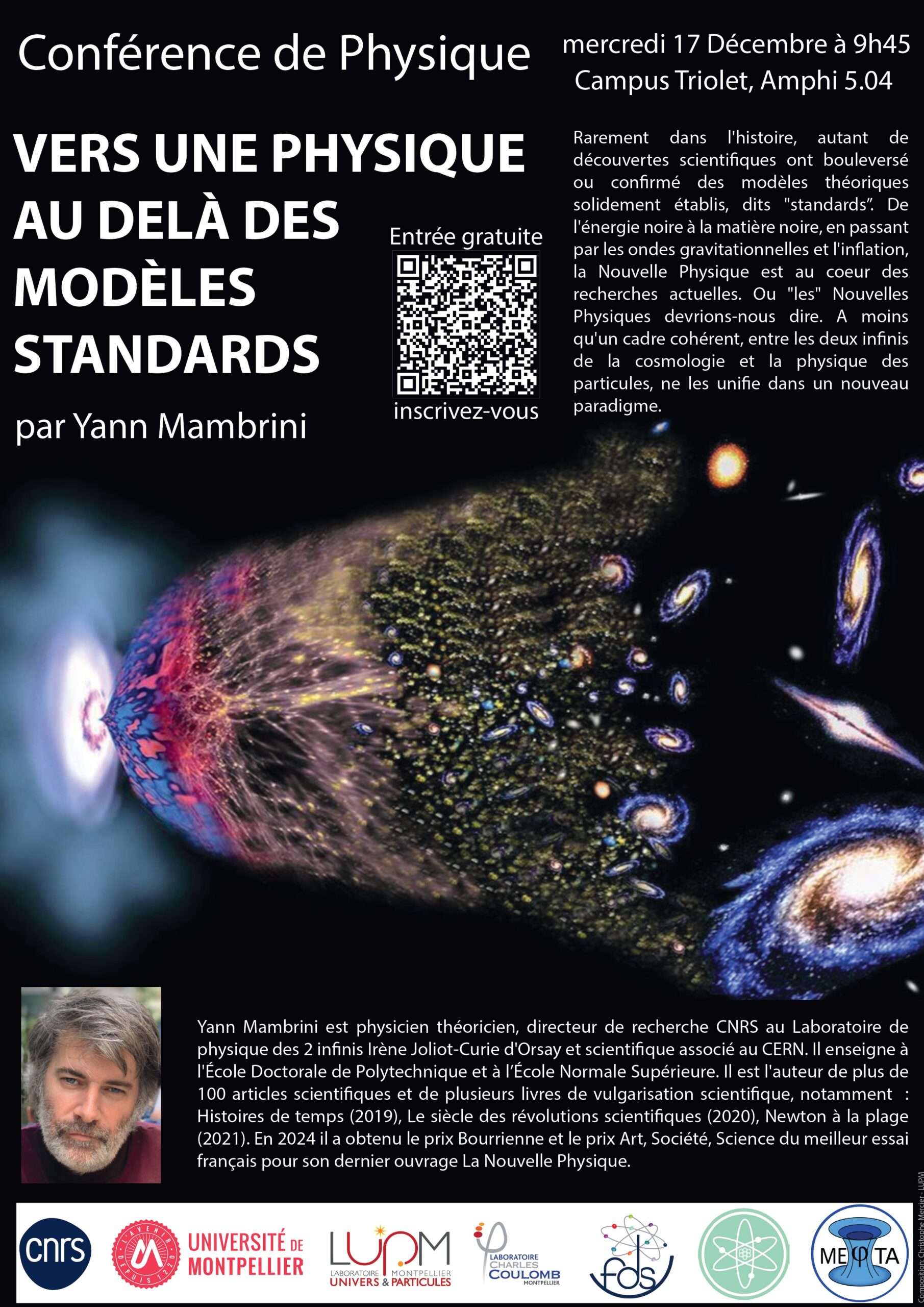 Yann Mambrini, physicien théoricien et directeur de recherche au CNRS, proposera une réflexion sur les découvertes qui bouleversent les modèles établis en physique. De l’énergie noire à la matière noire, en passant par les ondes gravitationnelles et l’inflation, cette conférence explorera les pistes vers une « Nouvelle Physique » et les paradigmes qui pourraient unifier cosmologie et physique des particules.